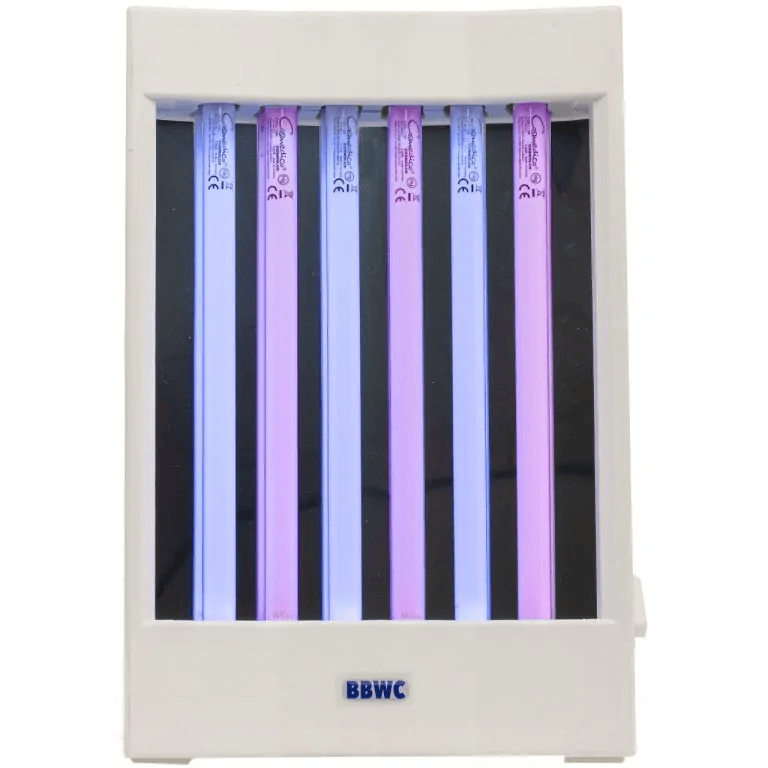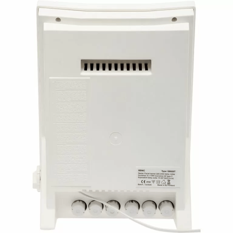 BBWC Face Tanner 915T Turbo Power er en kompakt og kraftfuld ansigtsbruner udstyret med 6 rør — 3 Pink og 3 Blue fra Cosmedico (produceret i Tyskland). Begge typer har samme styrke, og kombinationen er kendt for anvendelse i forbindelse med aknebehandling. Først og fremmest er dette dog et stærkt og effektivt ansigtssolarie.